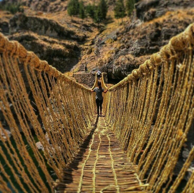 Exploración guiada por el puente colgante de fibras vegetales (ichu). Podrás cruzarlo de forma segura y conocer su historia, técnicas de construcción y significado cultural.